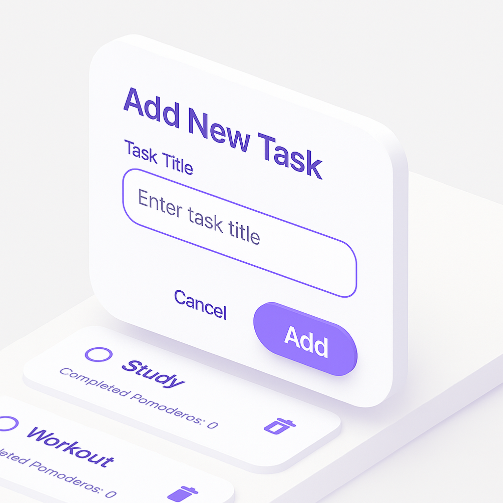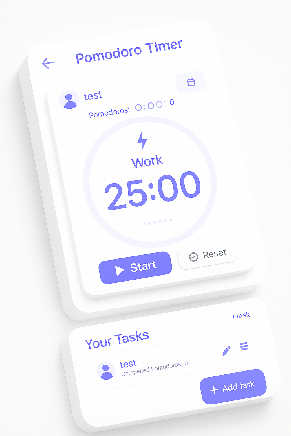 - Modular widgets: Task dropdown, timer logic, settings sliders